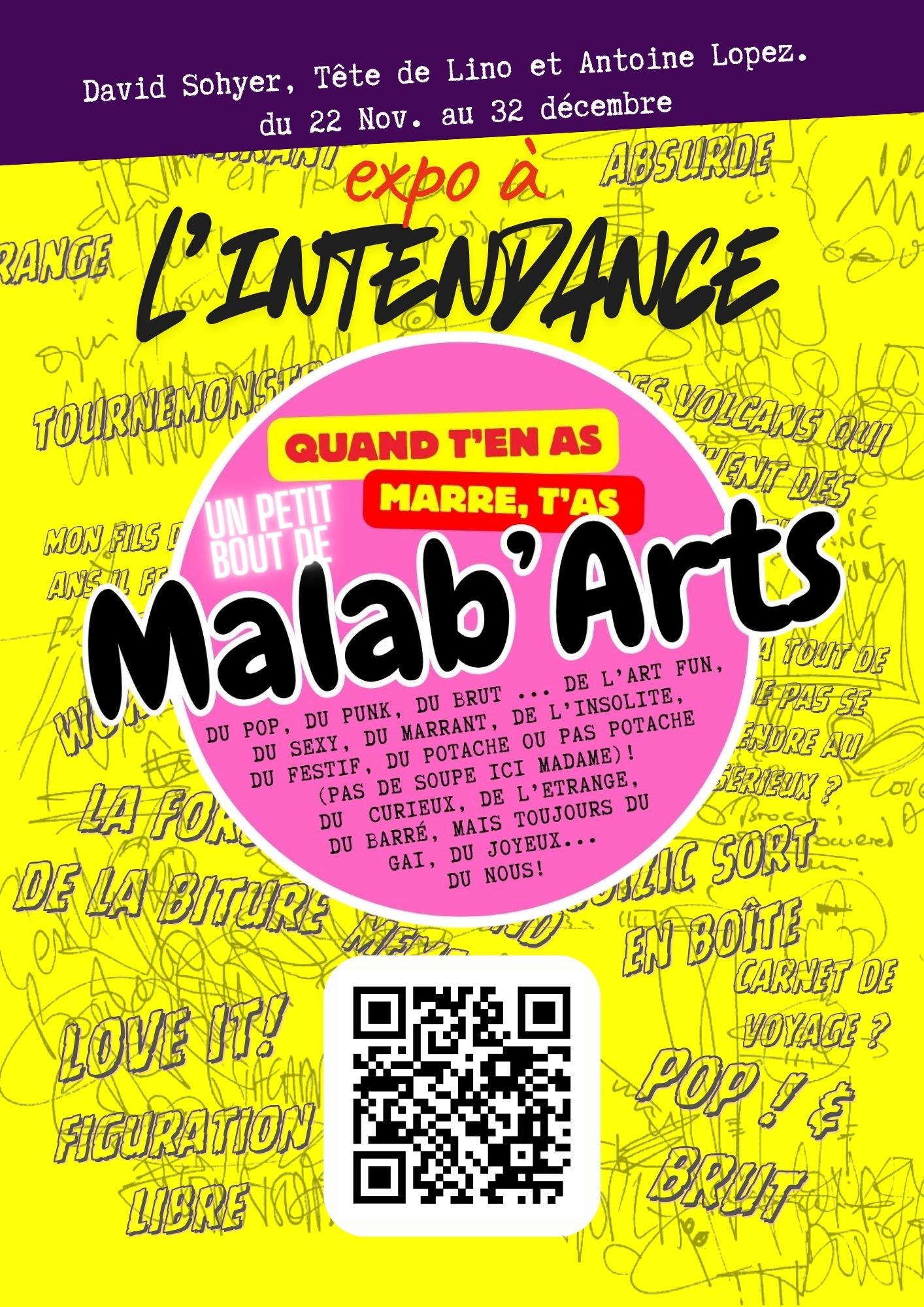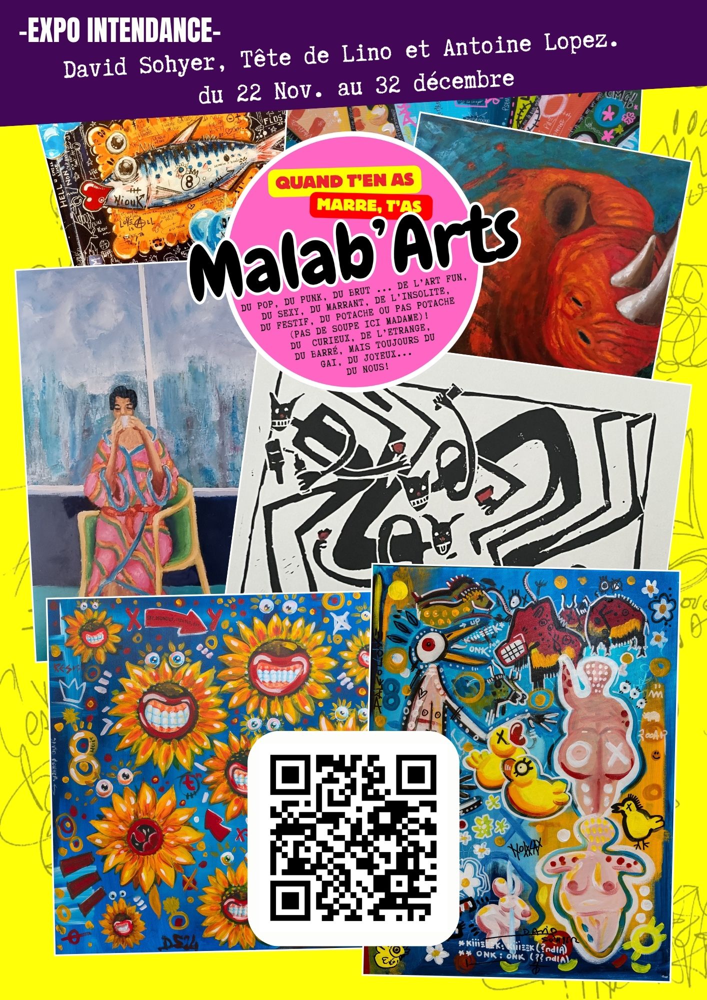 Malab’Arts, c’est une « artistothèque », un concept qui nous permettra, à nous les artistes de nous regrouper autour d’une thématique qui nous caractérise : l’humour, le contemporain, la couleur. Adieu tristesse, bienvenue au mouvement des Malab’Arts !
