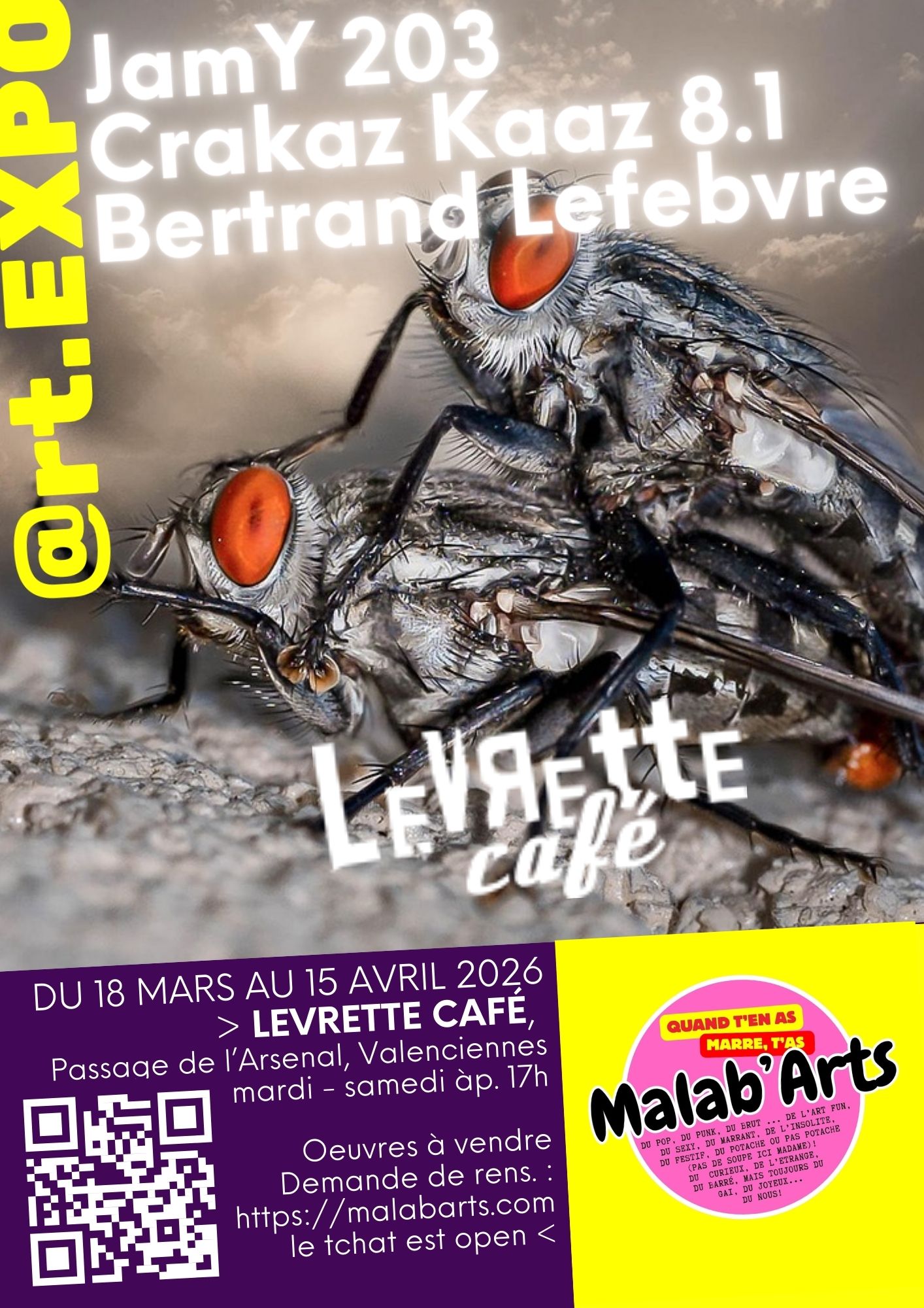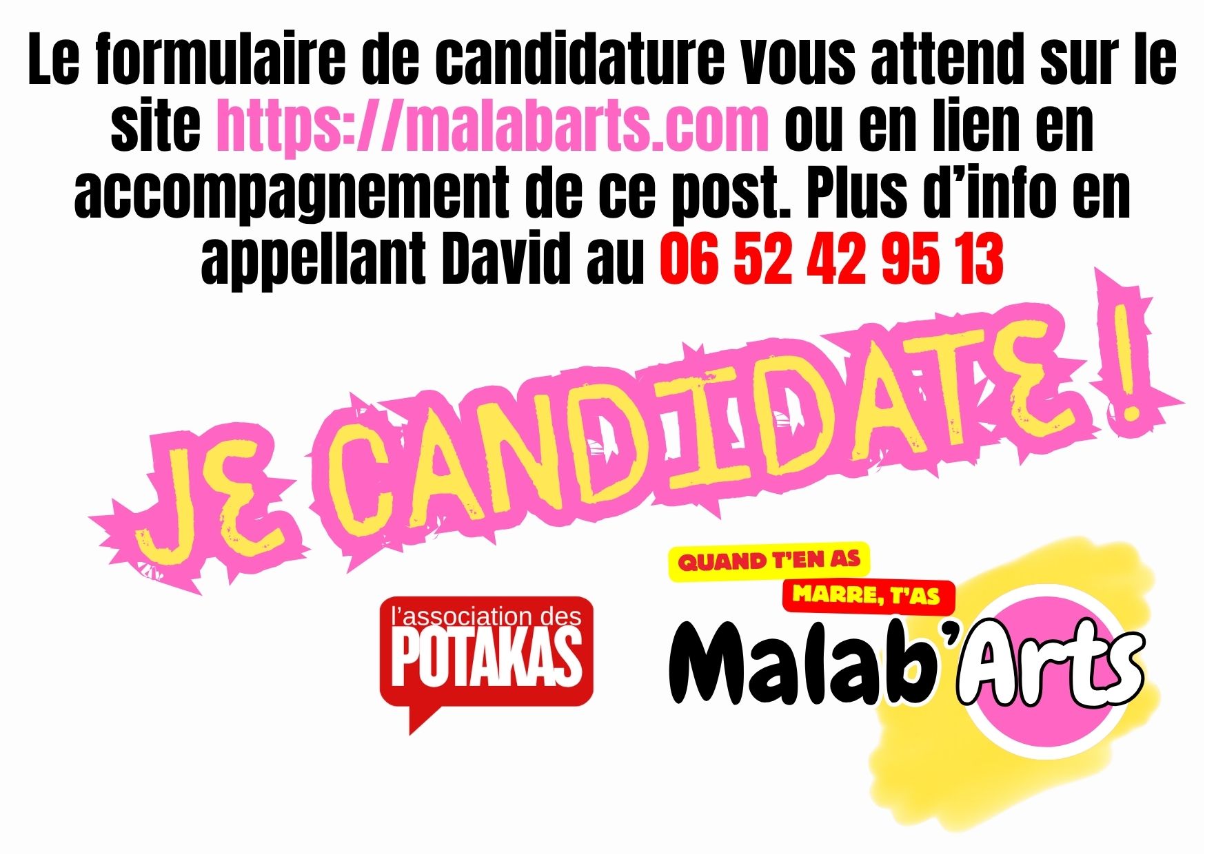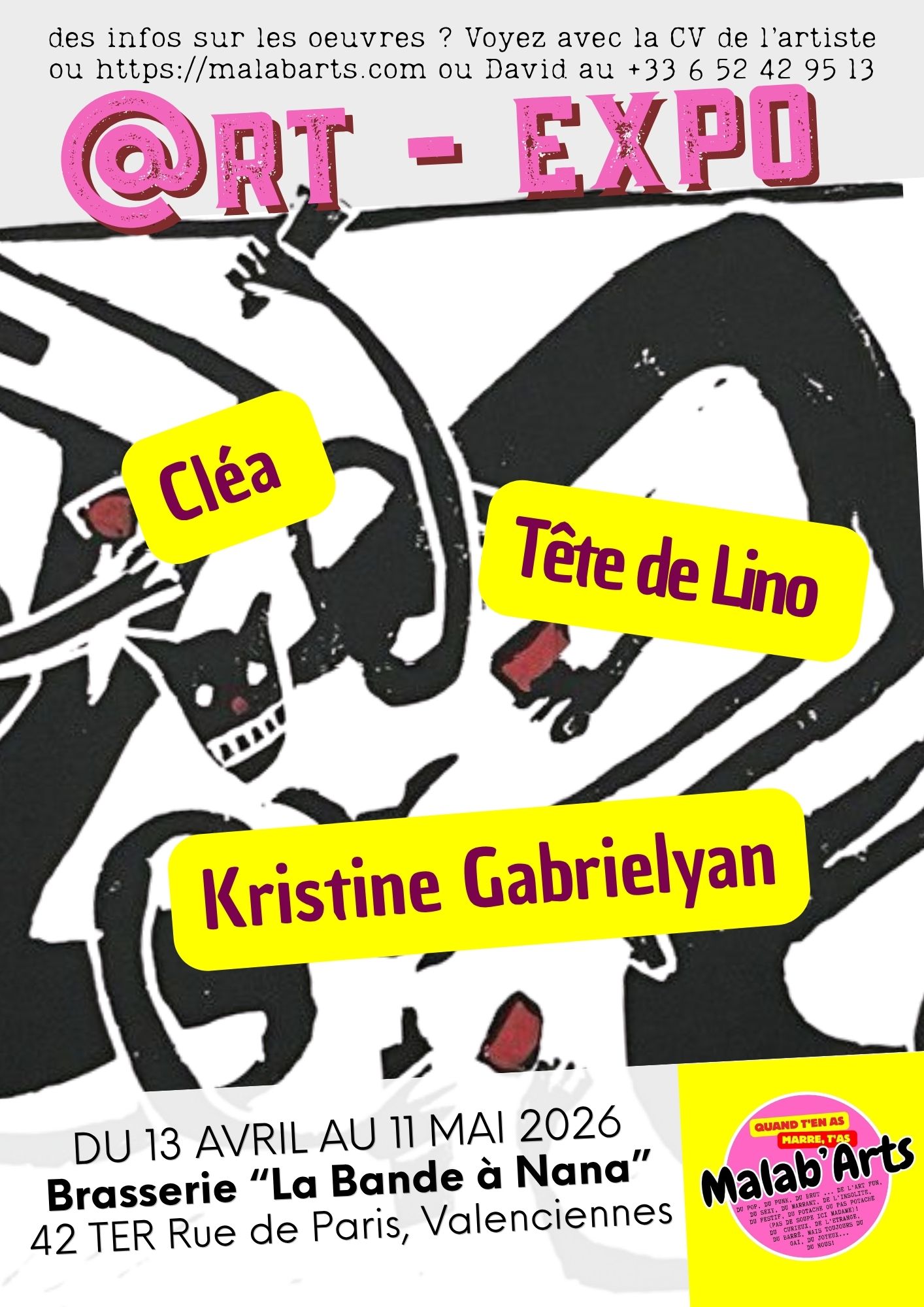 Malab’Arts, c’est une « artistothèque », un concept qui nous permettra, à nous les artistes de nous regrouper autour d’une thématique qui nous caractérise : l’humour, le contemporain, la couleur. Adieu tristesse, bienvenue au mouvement des Malab’Arts !