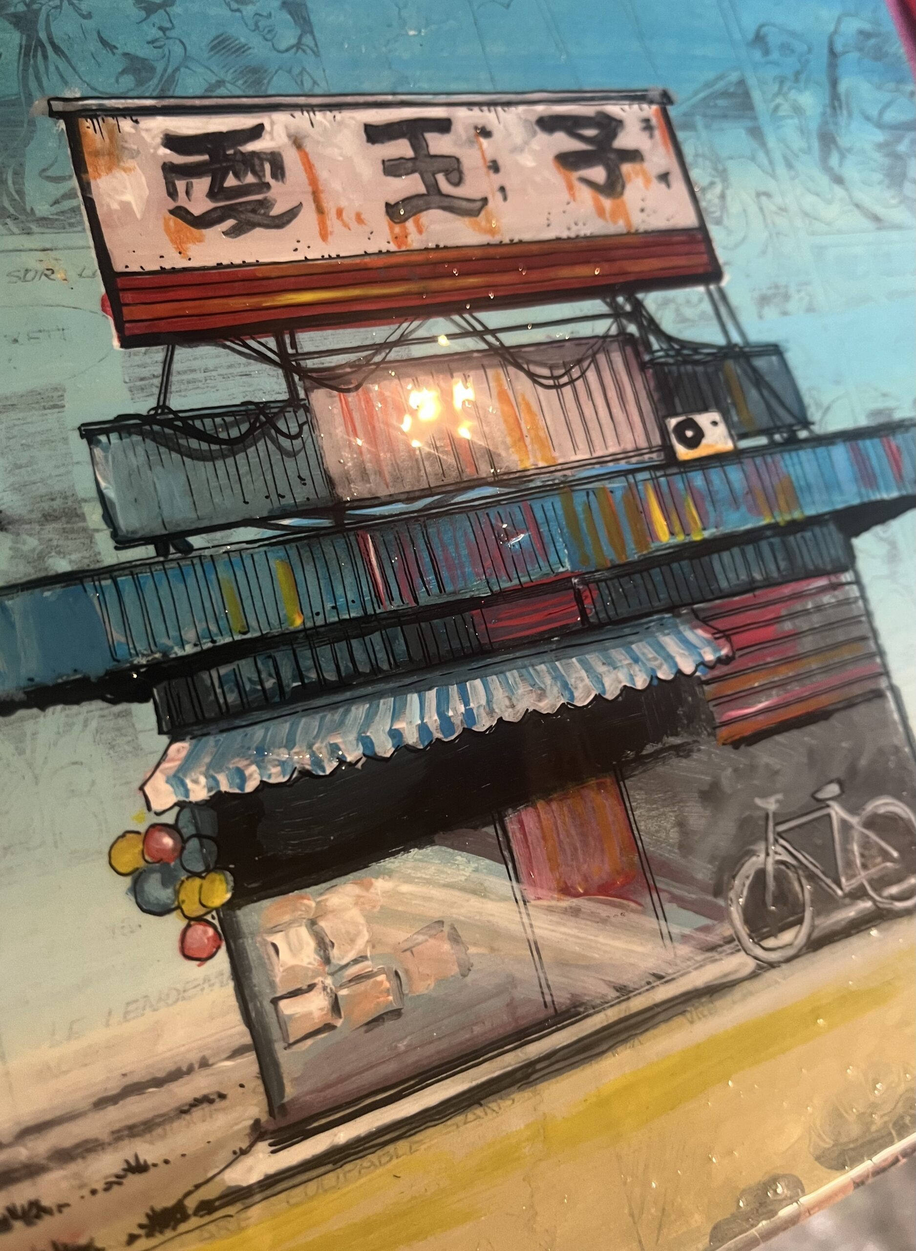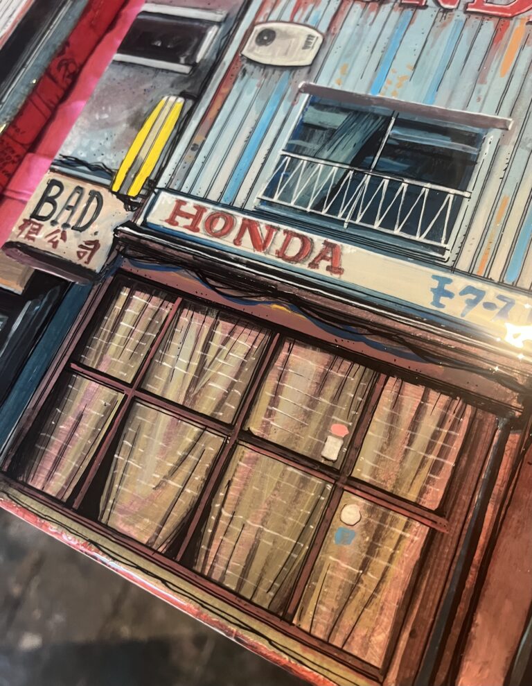 Certaines de mes illustrations s’apparentent à une critique au vitriol de la société contemporaine . Les péripéties des paysages des réserves Indiennes aux buildings du Japon sont pour moi une façon de dénoncer les travers d’un monde vicié par le consumérisme. Que ce monde conjugué au crépuscule puis à la sauce apocalyptique songeait entre autres les risques de la course au pétrole . Bref, que l’image cinématographique teintée de science fiction représente le silence des moteurs, le néant ensablé ,la chaleur écrasante et les lumières bleutées et ocre se confondant à la taule froisée des véhicules ou des bâtiments crasseux . Plus généreux dans la façon de peindre , un peu comme une mise à jour plus méticuleuse .