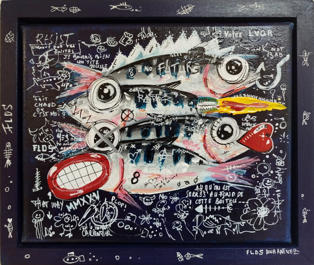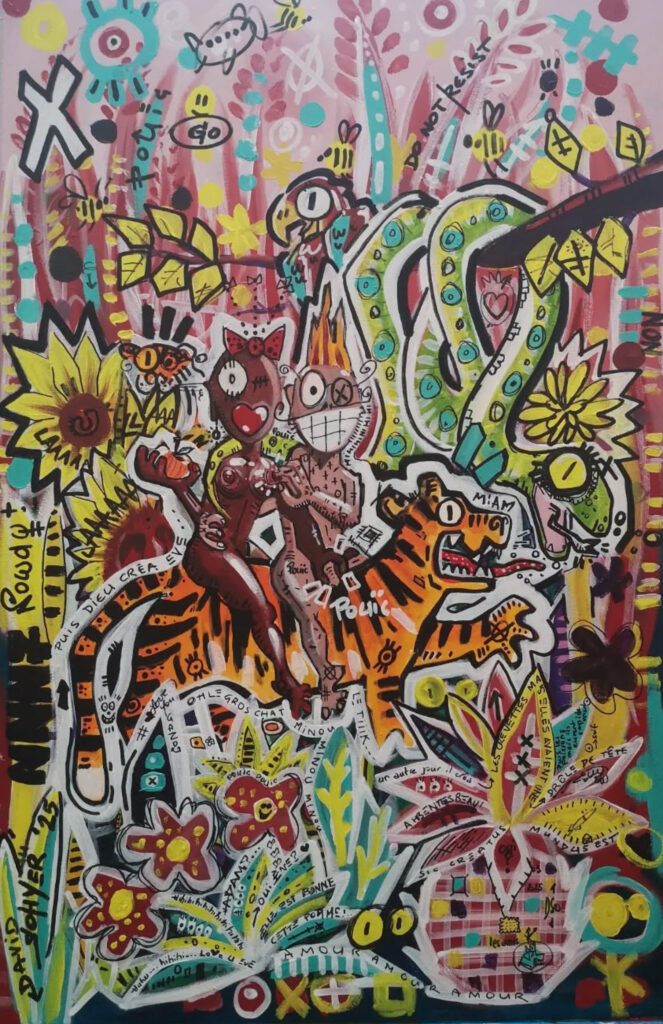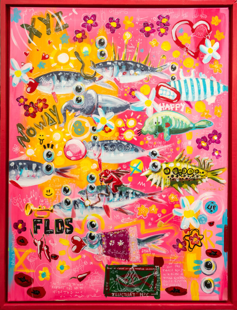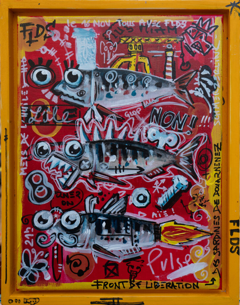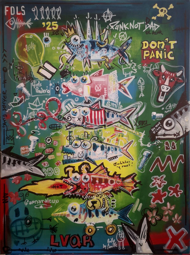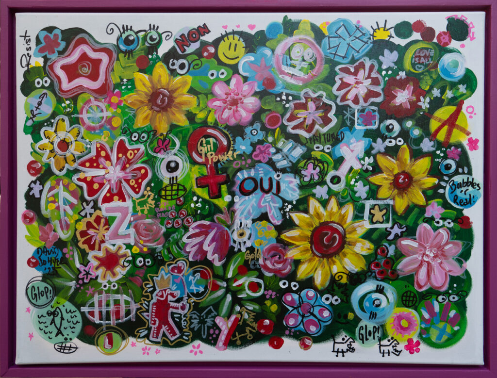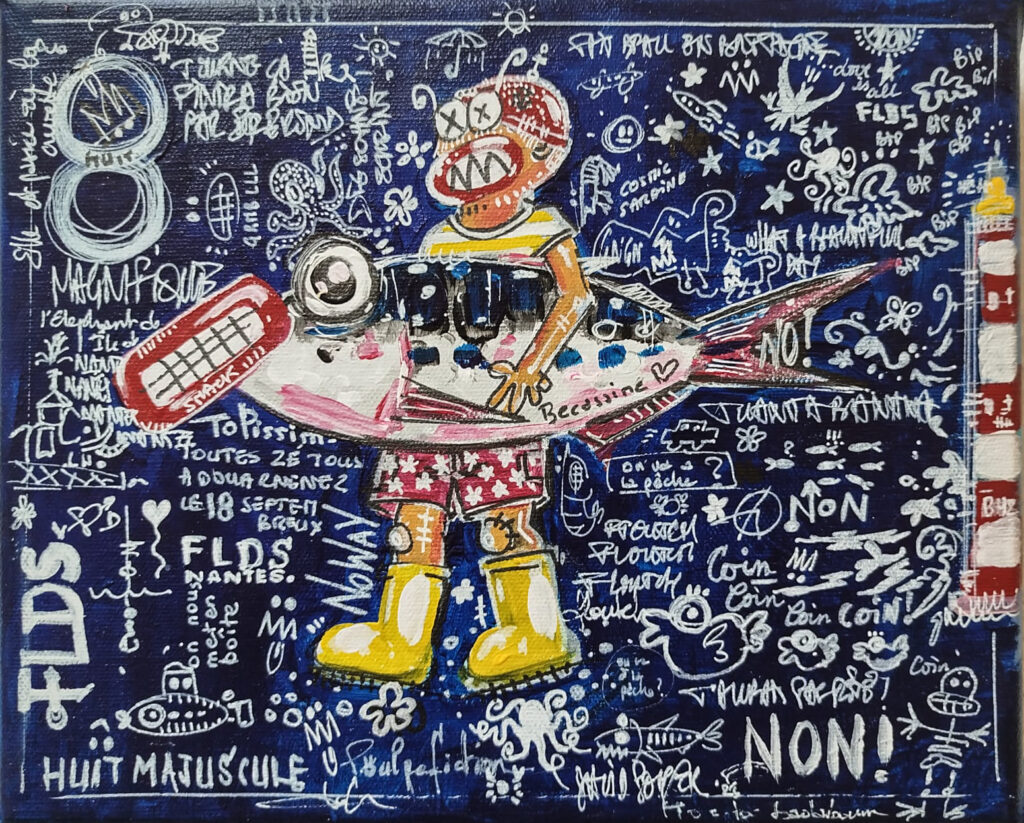 Longtemps restée personnelle, il décide récemment de confronter sa peinture aux regards. C’est pour lui l’occasion de rencontres, de partages. Si vous lui demandiez ce qu’est pour lui le sens de son travail, voilà ce qu’il vous dirait : « Des formes et des couleurs, des références pop ou iconiques, du loufoque ou du bucolique, j’ai soif de vie, de contact, d’amour et d’amitié. J’envie de dire oui, de dire non, de dire plus jamais, de résister, de construire, de jouer.