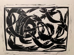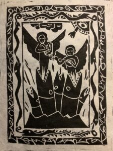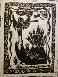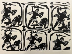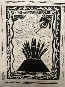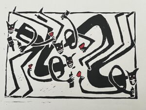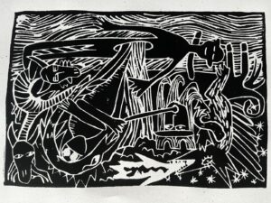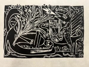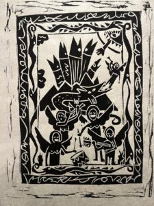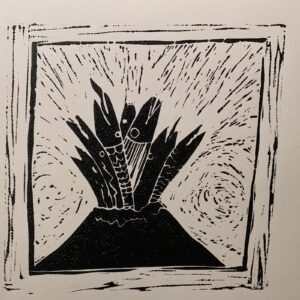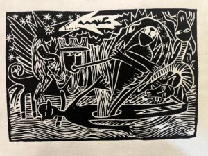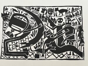 Forcé au repos suite à la défaillance de sa valve mitrale, François se lance tardivement dans la pratique de la gravure, réalisant ainsi un vieux rêve. Pourquoi la gravure? « No sé « comme disent les autochtones dans le Temple du Soleil. Peut-être, justement, la bande dessinée, mais aussi les enluminures, Frans Mazereel, l’art brut, les églises, l’art japonais, le graffiti … Un tas d’influences mais surtout la naïveté du débutant autodidacte. Ainsi dans les estampes signées Tête de Lino (son pseudo d’ “artiste”), les maisons ondulent , le roi fait du vélo, les anges ont les deux sexes et les volcans crachent des poissons. Après des essais sur gomme, il opte principalement, pour la lino gravure, technique simple à pratiquer chez soi avec peu de matériel. Il se laisse toutefois la possibilité d’explorer de nouvelles formes ou de nouveaux supports. Il a été sélectionné durant cinq ans par le Salon du Bon Vouloir à Mons.