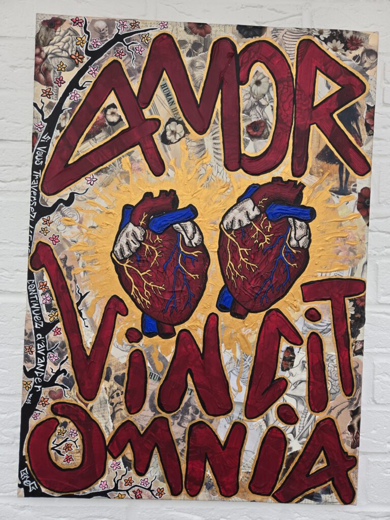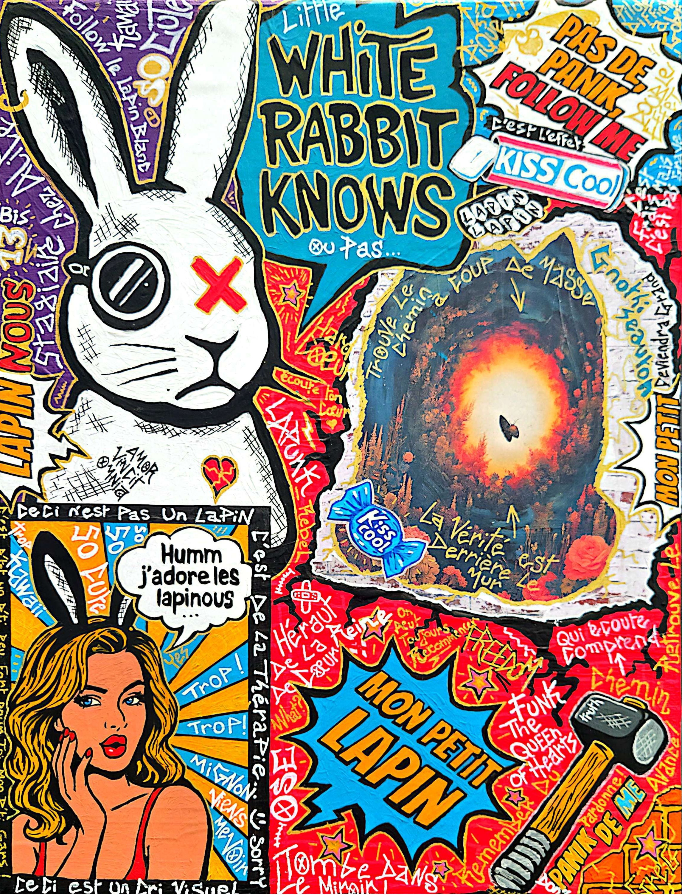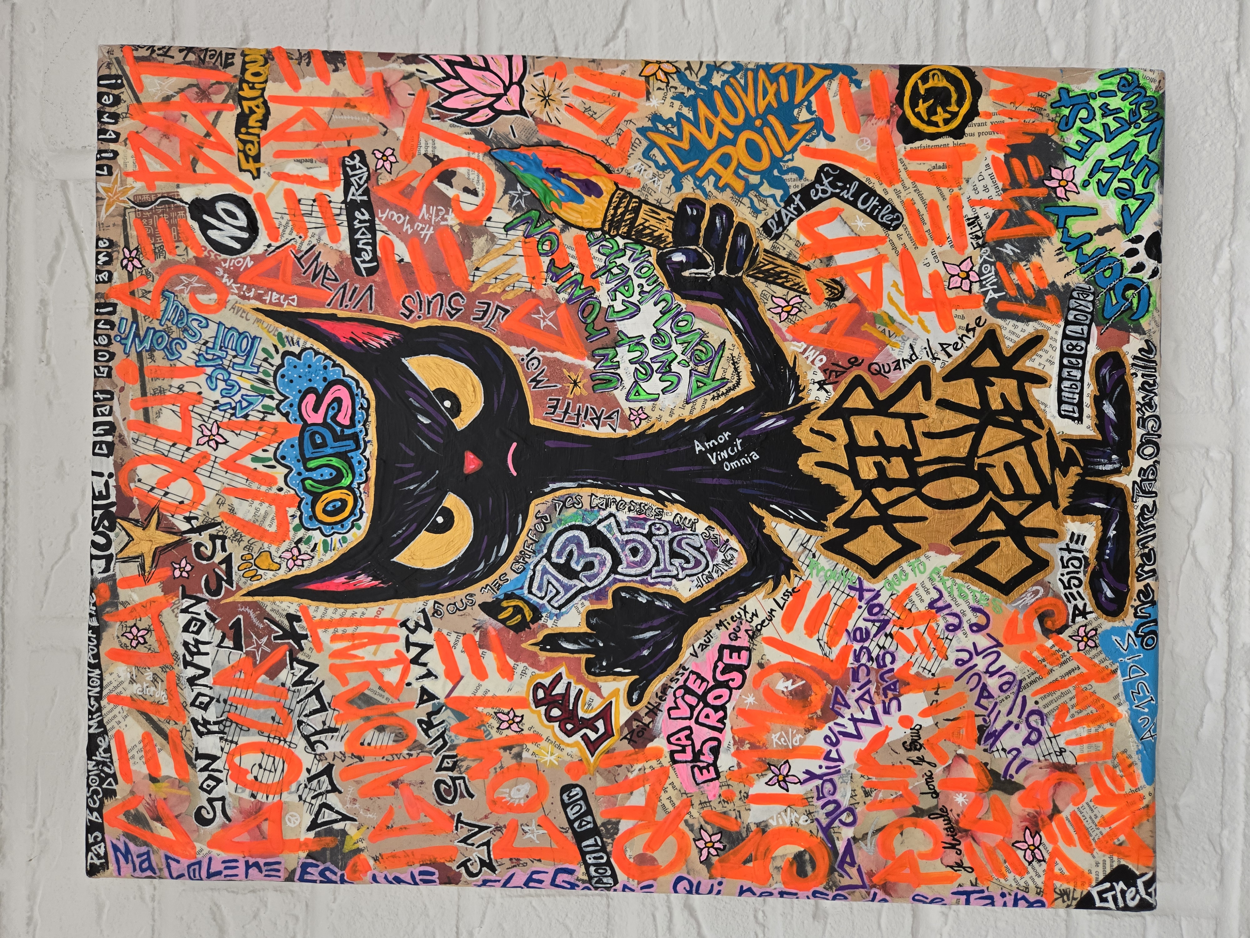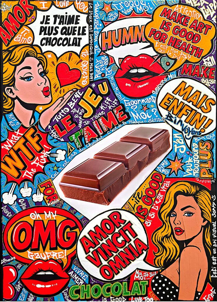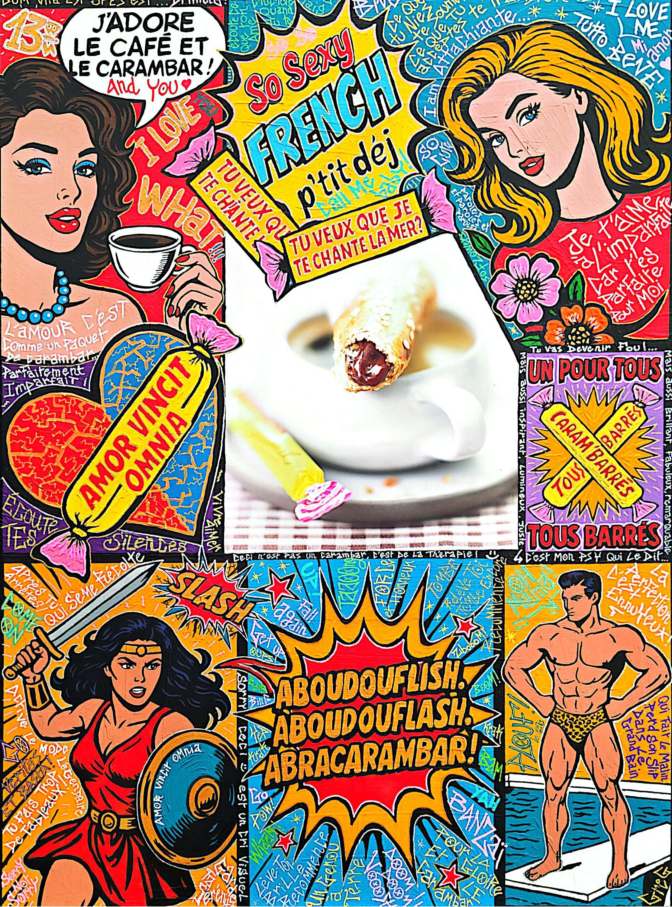 parfois piquant mais toujours avec bienveillance. Il mélange collage, photos, acrylique, il s’amuse avec les mots et les couleurs, et propose une caricature de la caricature pop art et urbaine