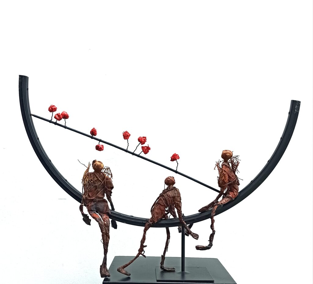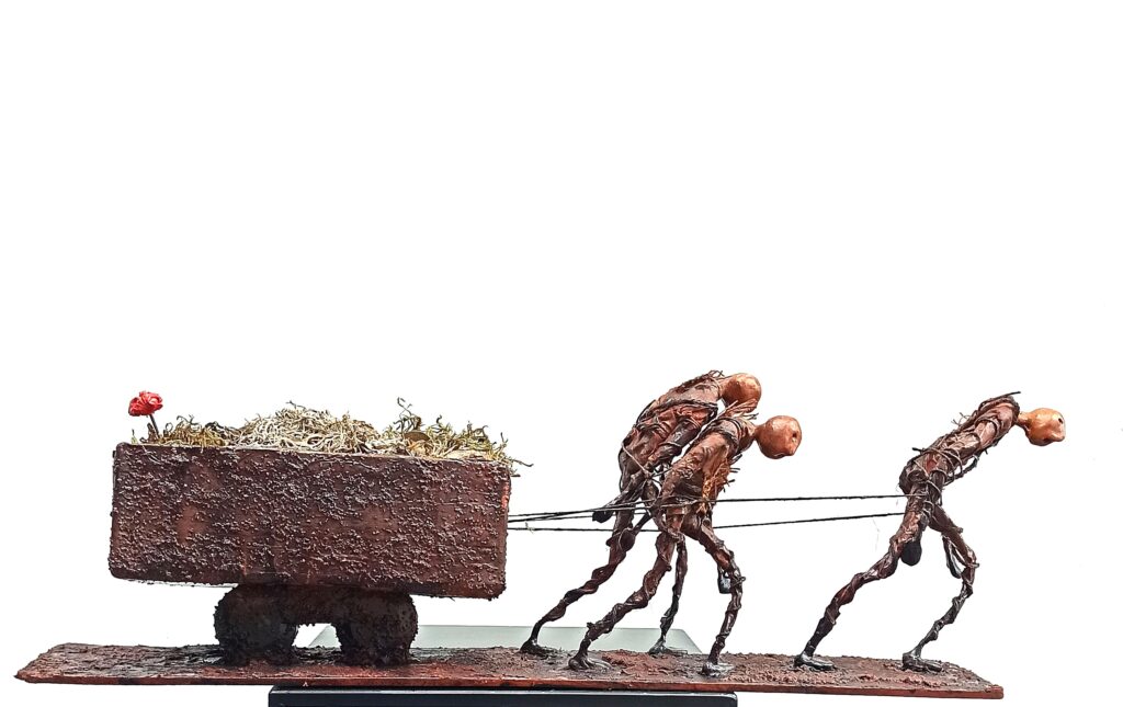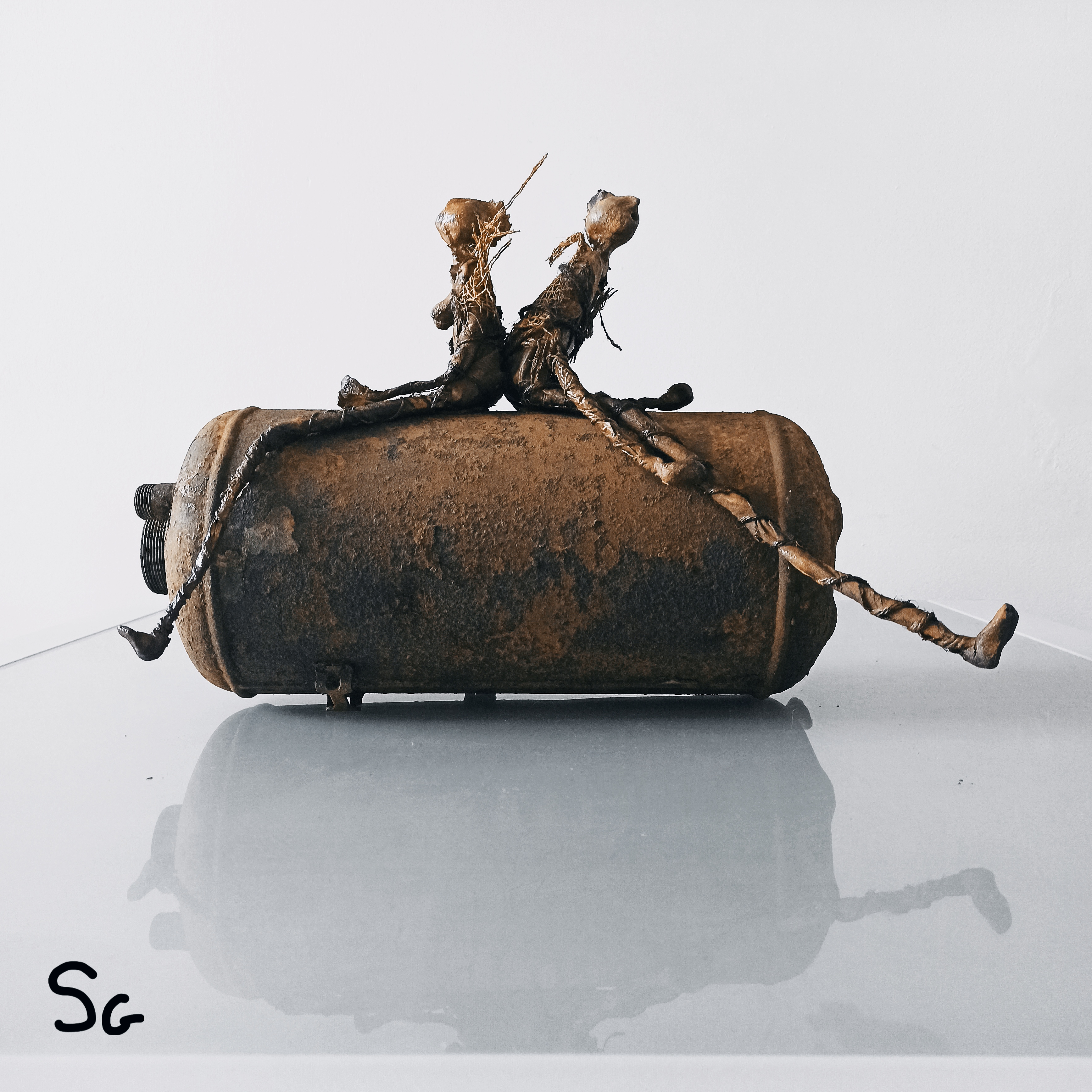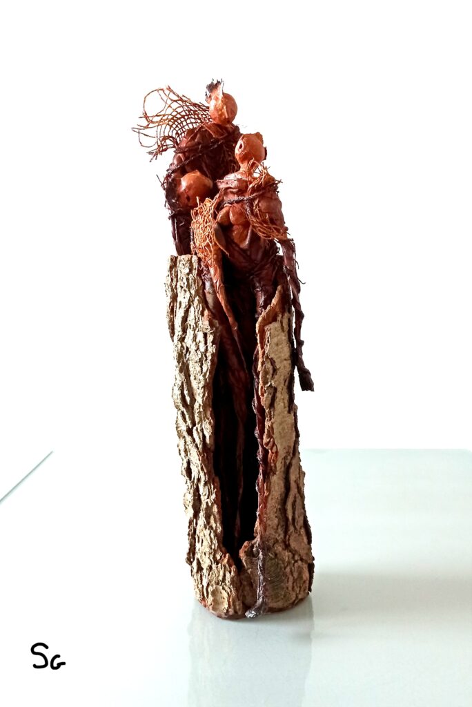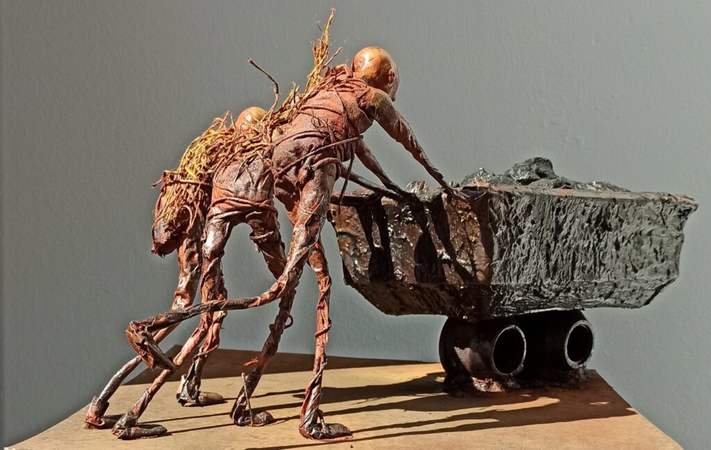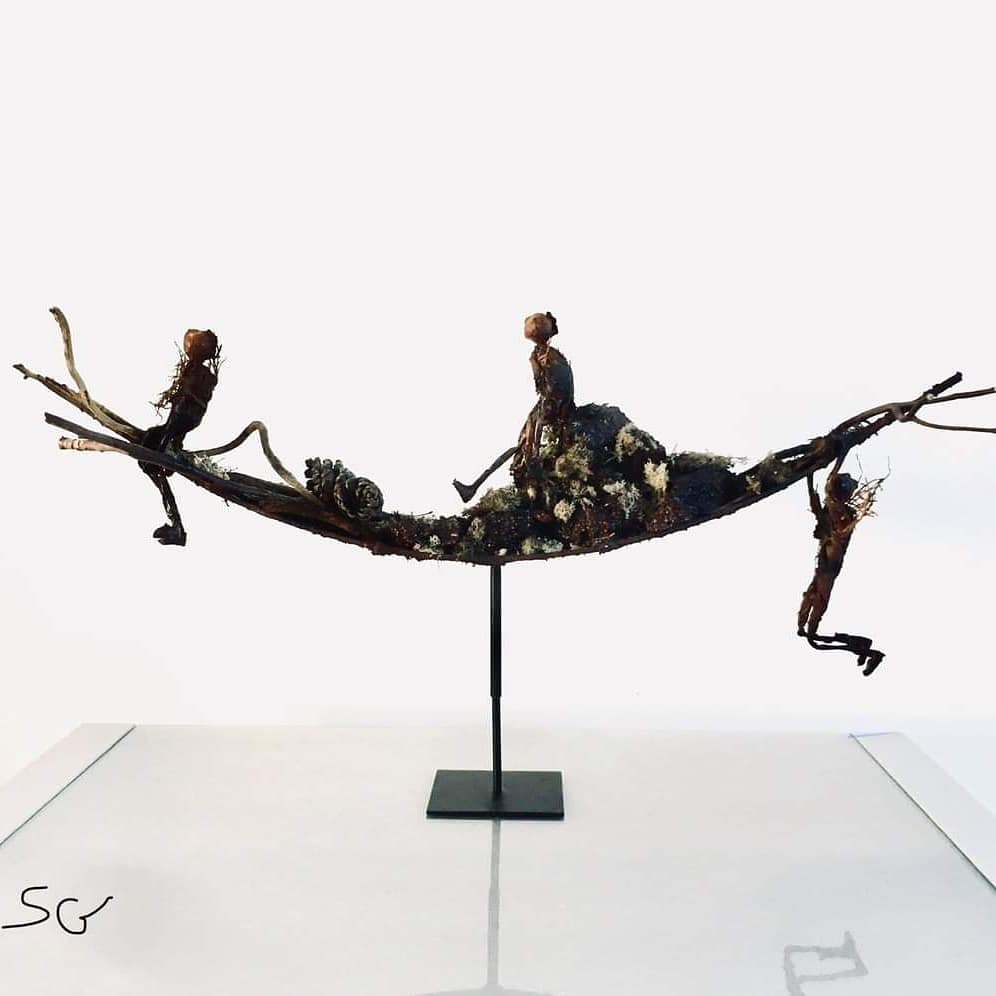 Son monde est sombre mais toujours avec une lueur d’espoir. Ses sculptures sont réalisées sans cuisson, avec des techniques mixtes combinées par essais-erreurs pour en faire une production réellement personnelle.